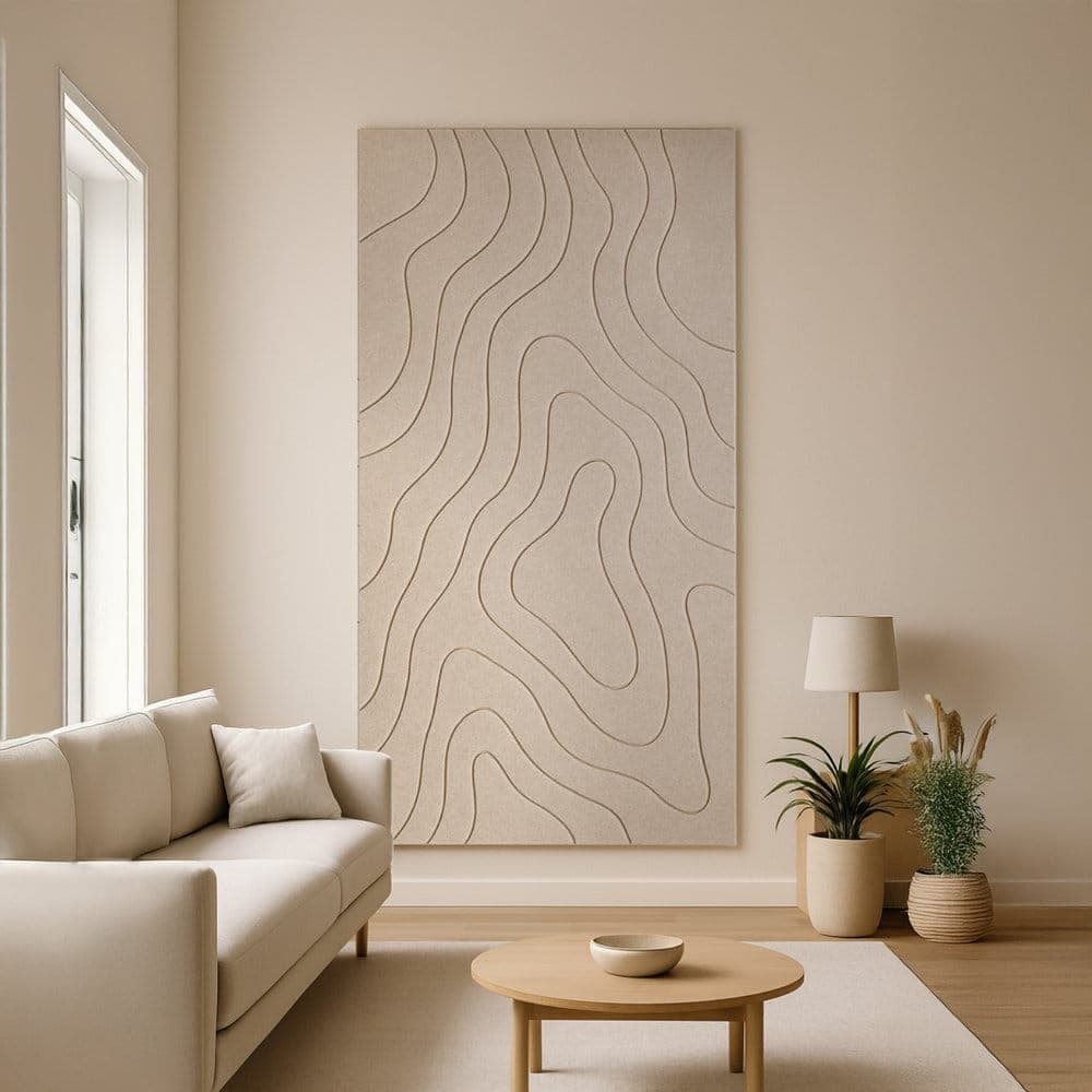 De Topographic Map is een akoestisch vilt wandpaneel met een kunstzinnig karakter. De organische lijnen, geïnspireerd op topografische hoogtelijnen, vormen samen een subtiel reliëf met een zacht 3D-effect. Hierdoor krijgt het paneel een bijna sculpturale uitstraling, zonder dat het overheerst.